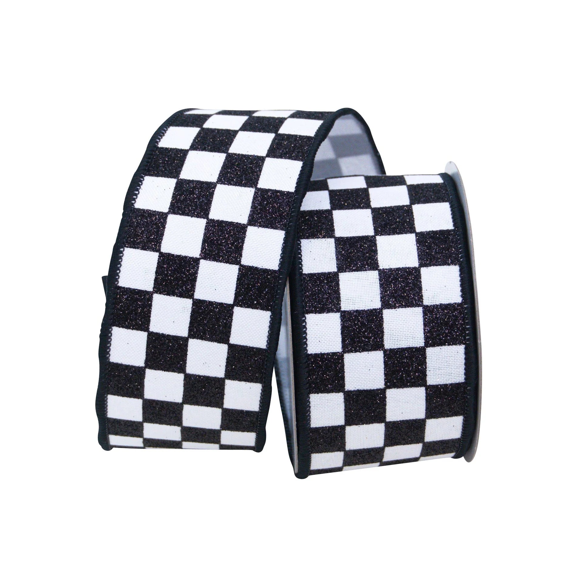 2.5”x10Y Black & White Glitter Checks Ribbon